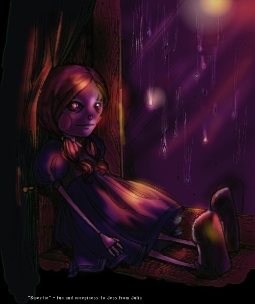 Sweetie is Jessica's. Every piece of art she does is utterly fantastic, and her characters are, how should I put it, devilishly inspiring. We did this as a bit of a trade, with me doing Sweetie and she doing my Teresa Knight.