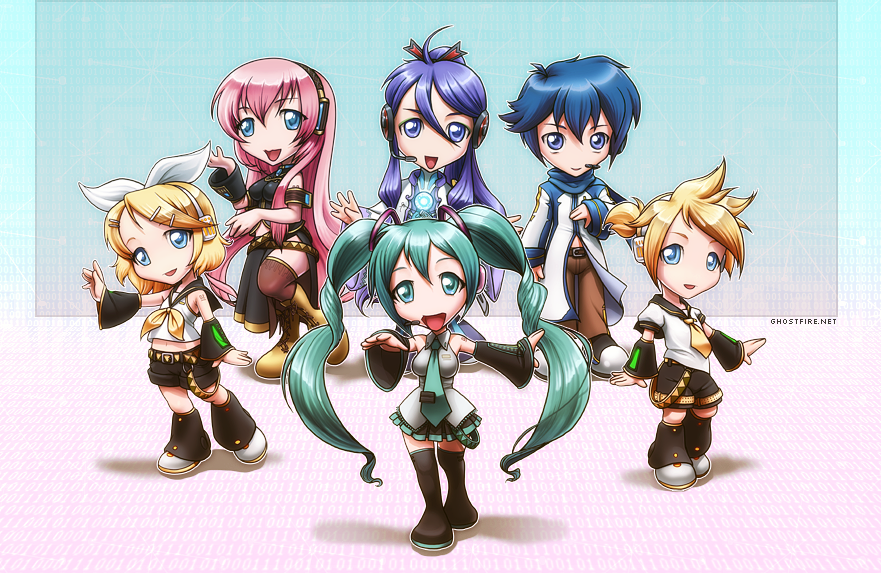 A few Vocaloid chibis: Miku, Rin, Len, Luka, Gakupo, and Kaito.