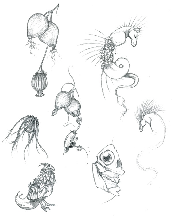 The little plant/rooster/slug thing on the bottom-left was my favorite concept for a monster of all, but it was rejected for being too normal. The game really was supposed to screw with your mind.